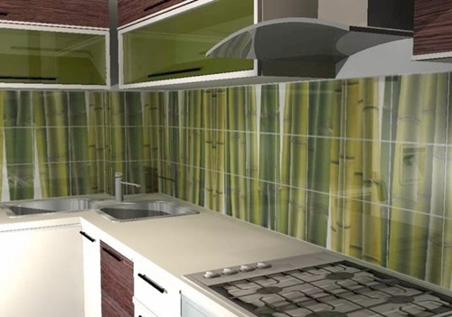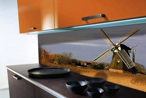 Но есть недостатки, которые часто заставляют делать выбор в пользу более современных материалов. Укладка кафельной плитки – трудоемкий, дорогостоящий и, в прямом смысле слова, грязный процесс, который нужно проводить перед монтажом кухонного гарнитура. Кроме того, стоимость кафеля или мозаики, по сравнению с другими материалами, неоправданно высока. Стекло: свежее декоративное решениеЕсли вы выбираете стеклянный фартук для своей кухни, значит, хорошо разбираетесь в последних модных тенденциях. Рабочая стеновая панель из стекла – это эстетическое удовольствие при минимальном времени монтажа. Толщина стекла кухонного фартука составляет около 6-8 мм, оно надежно крепится к стене специальными винтами. Главное преимущество стекла перед керамикой – стоимость и легкость установки. Кроме того, этот материал дает просто огромный простор для творчества. Современные технологии позволяют нанести на стекло практически любую картинку в хорошем качестве, вплоть до любимых фотографий домочадцев. Меньшую, по сравнению с керамикой, долговечность, можно устранить калением стекла или «бронированием» его специальной пленкой. Но этот процесс значительно повышает фартук из стекла в цене. Пластик: дешево и сердито